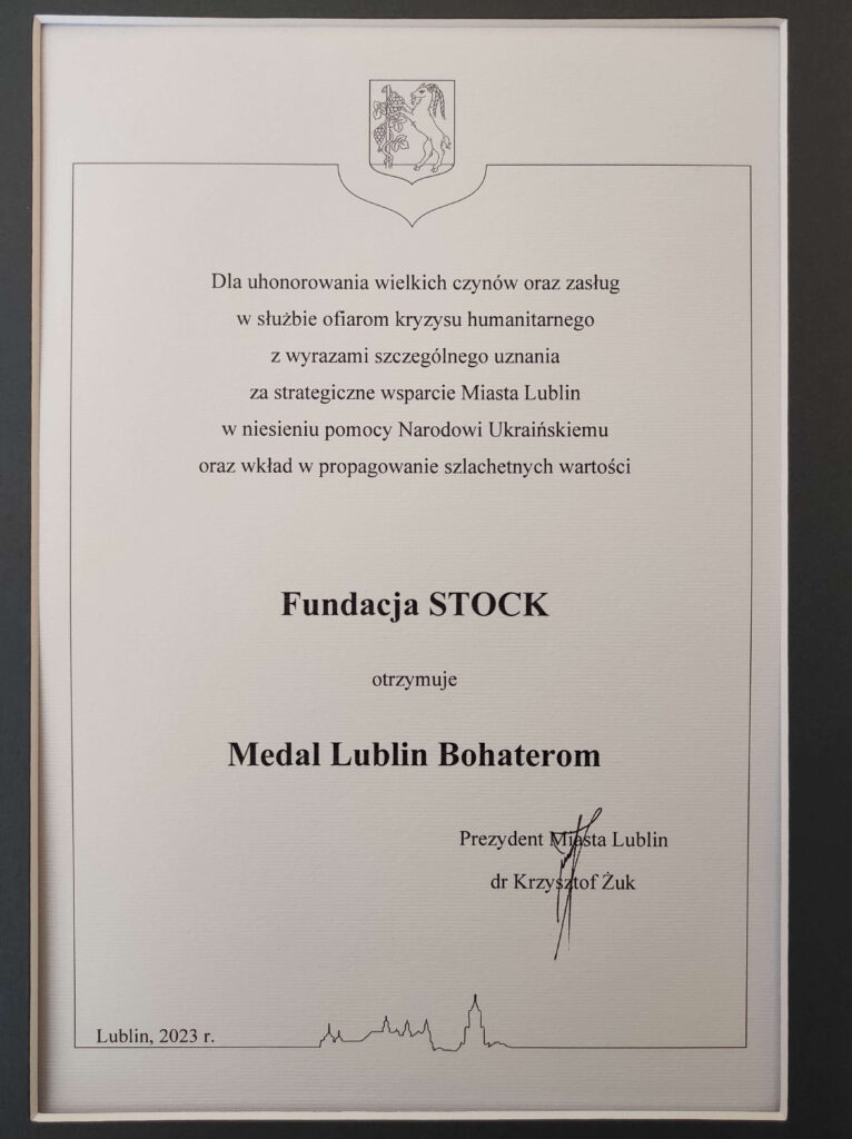 For its efforts in helping refugees, the Stock Foundation was awarded the Lublin Heroes Medal by the President of Lublin on the anniversary of the outbreak of war in Ukraine.